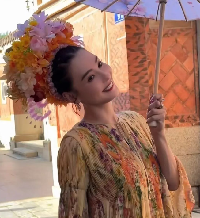 或许是对簪花造型格外满意,她还拿着粉色小花伞拍照留念,笑得格外开心,偶尔对着镜头比出剪刀手,卖萌的样子杀伤力十足。